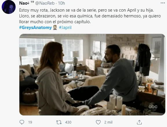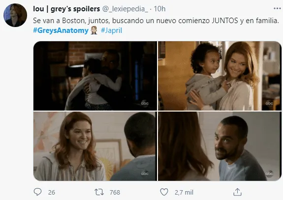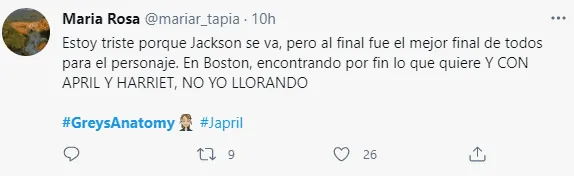 “Jesse Williams es un artista y activista extraordinario.Ver su evolución en los últimos 11 años, tanto en la pantalla como fuera de ella, ha sido un verdadero regalo. Aportómucho corazón, tanta atención y tanta inteligencia a su trabajo.Extrañaremos terriblemente a Jesse y extrañaremos a Jackson Avery, interpretadoa la perfección durante tantos años”, fueron las palabras de la showrunner Krista Vernoff a Deadline para despedir al artista.