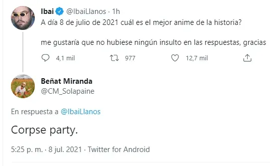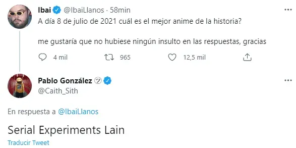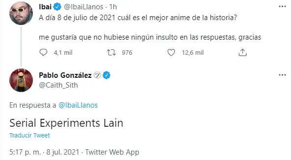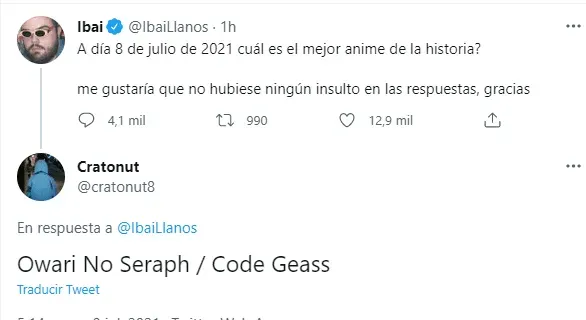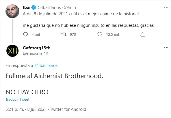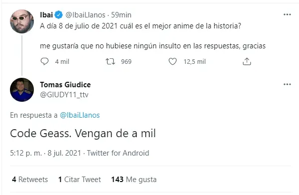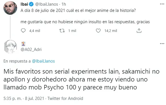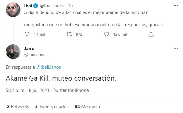 Ibai utilizó su cuenta de Twitter para lanzar la siguiente pregunta que explotó entre los fanáticos: “Adía 8 de julio de 2021, ¿cuál es el mejor anime de la historia? me gustaría que no hubiese ningún insulto en las respuestas, gracias”. La consulta rápidamente superó las tres mil respuestas y sigue sumando.