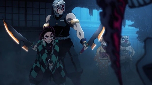 Anteriormente, vimos que Gyutaro sale del cuerpo de su hermana menor, Daki, y ambos se enfrentan a Tengen Uzui con un ataque rápido, pero que logra esquivar. Sin embargo, esto le deja una herida en la cabeza al Pilar del Sonido y poco a poco descubrimos que fue envenenado y su rostro cambia a morado en la parte superior. Tras una explicación de sus origenes y el avance del veneno, comienzan la batalla a la que se unen Zenitsu e Inosuke.