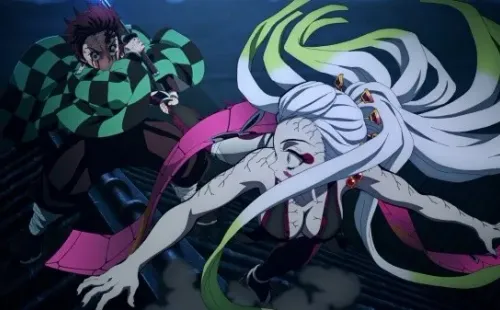 El enfrentamiento entre Tanjiro y Daki tuvo su esperada continuación. Cuando la demonio intentaba escapar para ir en busca de Tengen Uzui tras causar estragos en el barrio donde se encontraban, el jove fue tras ella para reanudar la pelea. Al notar el sufrimiento y las muertes de las personas a su lado, Kamado cambia su aspecto y su mirada para luego recitar algunas palabras que generaron un flashback de las memorias de Muzan Kibutsuji.