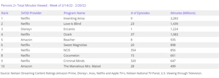 Lo segundo en el ranking semanal también es de Netflix y es el reality Love is Blind, con 1,439 millones de minutos vistos, mientras que el podio lo cerró Encanto de Disney+ con 1,224 millones de minutos visualizados. El resto del Top 10 de Nielsen se completó con: Ozark (1,083 M), Reacher (935 M), Dulces Magnolias (898 M), NCIS (856 M), Cocomelon (661 M), Criminal Minds (647 M) y The Marvelous Mrs. Maisel (499 M).