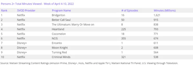 El medidor de audiencia Nielsen publica semanalmente las cifras oficiales de reproducciones del público estadounidense que mira televisión y las plataformas Netflix, Amazon Prime Video, Disney+, Hulu TV y Apple TV+. Debemos aclarar que los siguientes datos llegan con casi un mes de tardanza, ya que las compañías no revelan regularmente sus verdaderas visualizaciones.