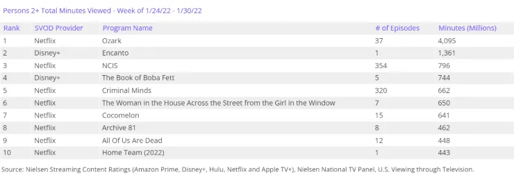 Al igual que la semana pasada, Encanto de Disney+ se posiciona en el segundo puesto con 1,361 millones de minutos, mientras que NCIS de Netflix se sube al podio con 796 millones de minutos. El resto del Top 10 se completa con: The Book of Boba Fett (744 M), Criminal Minds (662 M), The Womand in the House Across the Street from the Girl in the Window (650 M), Cocomelon (641 M), Archivo 81 (462 M), Estamos muertos (448 M) y Home Team (443 M).