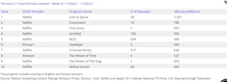 Cocomelon se ubicó en el segundo puesto con 786 millones de minutos vistos y en el podio se situó Una historia real, con 607 millones de minutos. El resto del Top 10 informado por Nielsen se completa con: Seinfeld (592 M), NCIS (568 M), Hawkeye (560 M), Criminal Minds (544 M), La Rueda del Tiempo (537 M), El Poder del Perro (470 M) y Selling Sunset (440 M).