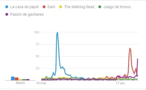 En Colombia sucede algo similar, donde otraproducción colombiana, ‘Pasión de Gavilanes’ con su regreso a la televisión, se codea con los grandes productos internacionales. En esta región vuelve al liderato ‘La casa de papel’, seguida muy de cerca por ‘Dark’.