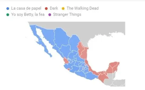 ¿Y en México? El ranking se mantiene pero con dos pequeñas variaciones. ‘Dark’ se queda con el puesto 1 pasando a La casa de papel y ‘Game of Thrones’ sale del mismo dejándole su lugar a ‘Yo soy Betty, la fea’. Y el país se divide entre los que prefieren a la serie española y los que van por la alemana.