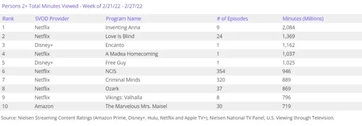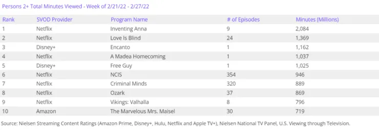 Netflix también ocupó la segunda plaza con el reality Love is blind, con 1,369 millones de minutos visualizados, seguido de Encanto de Disney+, con 1,162 millones de minutos. El resto del Top 10 se completa con: A Madea Homecoming (1,037 M), Free Guy (1,025 M), NCIS (946 M), Criminal Minds (889 M), Ozark (869 M), Vikings: Valhalla (796 M) y The Marvelous Mrs. Maisel, de Prime Video (719 M).
