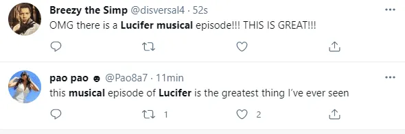Además, la productora se expresó sobre la escena dondeLucifer y Dios cantansus problemas con la canción “Les Mis” “I Dreamed a Dream”. “Al principio solo iba a ser una canción que Lucifer le iba a cantar a su padre.Y luego decidimos que sería mucho más fuerte ser un dúo, así que miramos un par de canciones.Father and Sonfue una canción que dimos vueltas durante un rato.Pero la canción Les Mises tan emocionante.Y realmente es desgarrador.Todo el set estaba llorando”, reveló.