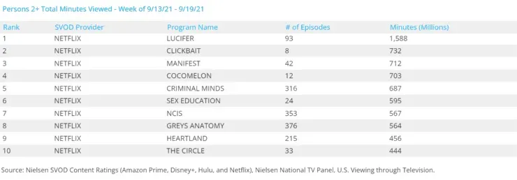 Clickbait se mantiene en el segundo lugar (732 millones de minutos), mientras que Manifest ocupa la tercera plaza (712 millones de minutos). Por el momento Netflix no ha comunicado sus números, pero de acuerdo a lo mostrado por Nielsen el gran éxito del mes hasta ahora es Lucifer.