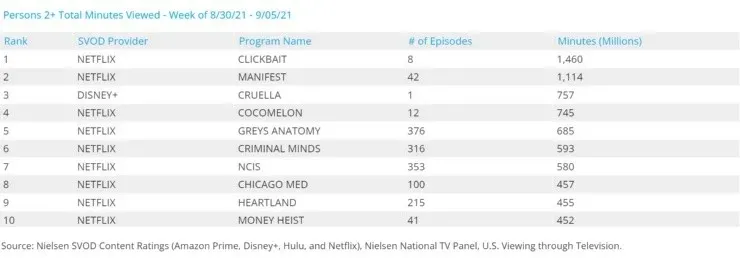 El Top 3 lo completa Cruella, siendo lo más elegido de Disney+ al estar disponible sin cargo adicional, con 757 millones de minutos reproducidos. El resto del ranking es todo de Netflix: Cocomelon (745 M), Grey’s Anatomy (685 M), Criminal Minds (593 M), NCIS (580 M), Chicago MED (457 M), Heartland (455 M) y La Casa de Papel (452 M).