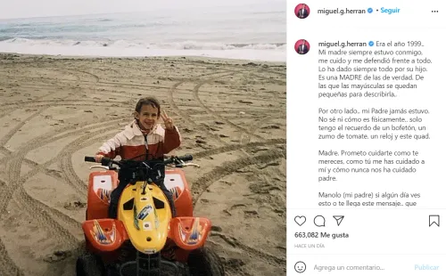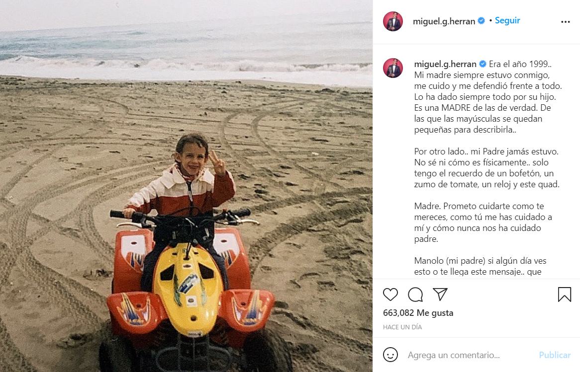 Continuó: “Madre. Prometo cuidarte como te mereces, como tú me has cuidado a mi y como nunca nos ha cuidado padre”. Tras la dedicatoria, añadió: “Manolo (mi padre) si algún día vez esto o te llega este mensaje… Que sepas que ni te odio, ni te guardo rencor… Supongo que no se puede odiar a un desconocido”. Inmediatamente recibió miles de comentarios de colegas y fans, que hicieron alcanzar la publicación más de 600 mil likes.