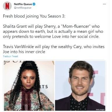 Ya está confirmado que Penn Badgley y Victoria Pedretti regresarán a la serie como los icónicos Joe y Love. Luego, quienes se suman a esta historia son Shalita Grant, una madre influencer que se hace amiga de la protagonista y Travis Van Winkle, un millonario que se hará amigo de la estrella de la tira.