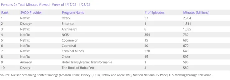 Encanto se ubicó en el segundo lugar con 1,511 millones de minutos vistos y Archivo 81 se subió al podio con 1,035 millones de minutos. El resto del Top 10 se completó con: NCIS (732 M), Cocomelon (686 M), Cobra Kai (670), Criminal Minds (648 M), Cheer (597 M), Hotel Transylvania: Transformania (595 M) y The Book of Boba Fett (580 M).