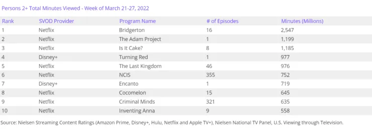 Lo cierto es que la plataforma depositó en el podio a otras producciones del momento, como The Adam Project, con 1,199 millones de minutos vistos y el reality ¿Es pastel?, con 1,185 millones de minutos. El resto del Top 10 se completó con: Red (977 M), The Last Kingdom (976 M), NCIS (752 M), Encanto (719 M), Cocomelon (645 M), Criminal Minds (635 M) e Inventando a Anna (558 M).
