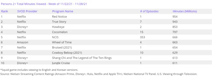 Disney+ se ubica tercera con lo que fue el primer episodio de Hawkeye, serie del Universo Cinematográfico de Marvel, con 853 millones de minutos. El resto del Top 10 se completa con: Cocomelon (797 M), NCIS (666 M), La Rueda del Tiempo (663 M), Herida (645 M), Cowboy Bebop (629 M), Shang-Chi y la Leyenda de los Diez Anillos (613 M) y Jungle Cruise (611 M).