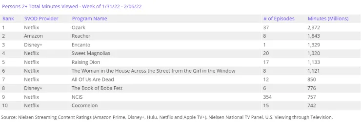 La competencia aún mira de atrás: Reacher de Amazon Prime Video se ubicó en el segundo puesto con 1,843 millones de minutos y Encanto de Disney+ se posicionó tercera con 1,329 millones de minutos. El resto del Top 10 se completó con Dulces Magnolias (1,320 M), Raising Dion (1,133 M),The Woman in the House Across the Street from the Girl in the Window (1,121 M), Estamos muertos (850 M), The Book of Boba Fett (776 M), NCIS (757 M) y Cocomelon (742 M).