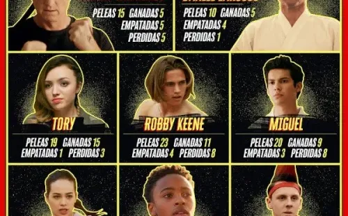 En la ficción encontramos a múltiples rostros que forman parte de diferentes bandos, pero los principales de ahora en más se ubican en Miyagi-Do, Colmillo de Águila y Cobra Kai, donde parecen estar los alumnos que más problemas buscan para resolverlos de manera violenta, ya que así es la bajada del malvado John Kreese. Esto es completamente cierto, según Netflix, después de publicar que Tory Nichols es quien más peleas ganó en lo que va de la historia.
