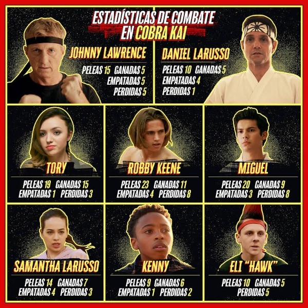 Las estadísticas presentadas suman las cuatro temporadas, tres películas y cinco torneos de All Valley. El personaje interpretado por Peyton List cuenta con un total de 19 peleas, de las cuales se fue victoriosa en 15, derrotada en 3 y se llevó solo un empate. En segundo lugar de enfrentamientos ganados encontramos a Robby Keene, peleando unas 23 veces y un saldo de 11 triunfos, 8 caídas y 4 empates.
