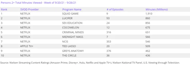 El podio sigue con Sex Education (856 millones de minutos) gracias a los nuevos episodios de su tercera temporada. Cocomelon (675 M) y Criminald Minds (651 M) se ubican cuarto y quinto respectivamente, y el resto del Top 10 se completa con Misa de Medianoche (566 M), NCIS (546 M), Ted Lasso de Apple TV+ (509 M), Grey’s Anatomy (462 M) y The Circle (436 M).