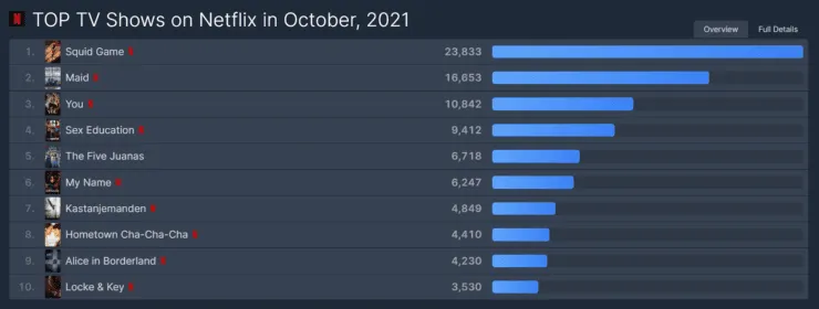Al igual que el mes pasado, El Juego del Calamar lideró el ranking de lo más visto a lo largo del mes en Netflix. Se trata de un nuevo logro de este drama coreano que se convirtió en un verdadero fenómeno en todo el mundo, ya que llegó al catálogo el 17 de septiembre y hasta el día de hoy se mantiene como lo más elegido. Además, fue tendencia en la noche de Halloween este año con sus características vestimentas, en clara referencia de que el impacto ha sido mayor de lo que se creía.