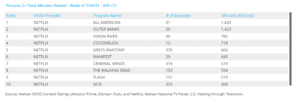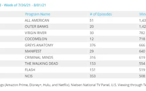 Semana a semana contamos con una nueva actualización del medidor de audiencia Nielsen, quienes se basan en los usuarios que utilizan televisores y cubren los servicios de streaming Netflix, Amazon Prime Video, Hulu y Disney+. Estos números se informan casi un mes de retraso, ya que estas plataformas principales en Estados Unidos no publican regularmente sus propios datos verificables.