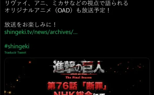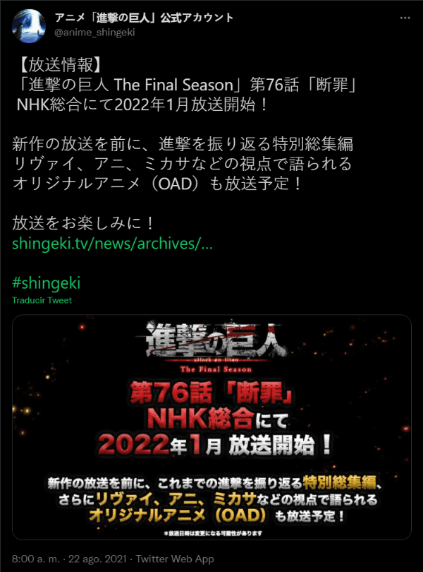 Una vez finalizado el concierto, las redes sociales de informaron que la parte 2 de la temporada final de Shingeki no Kyojin se estrenará en enero de 2022, con el episodio 76 llamado “Condenación”. El director Yuichiro Hayashi agradeció a los fanáticos y adelantó: “Desde la batalla a gran escala en el distrito de Shiganshina hasta la historia del origen de los Titanes, finalmente nos acercamos al clímax de la temporada.También estamos asumiendo muchos desafíos nuevos en términos de imágenes”.