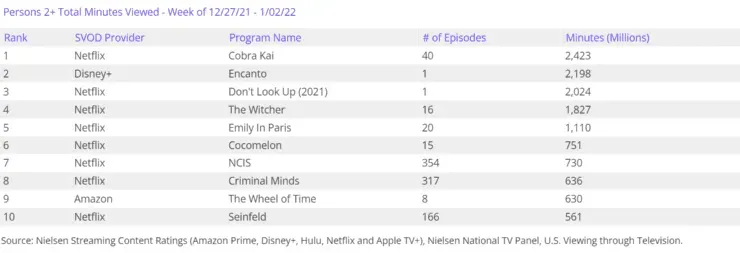 El segundo lugar del ranking posiciona a la película Encanto de Disney+ con 2,198 millones de minutos y en el podio también se ubica Don’t Look Up con 2,024 millones de minutos. El resto del Top 10 se completa con: The Witcher (1,827 M), Emily in Paris (1,110 M), Cocomelon (751 M), NCIS (730 M), Criminal Minds (636 M), La Rueda del Tiempo (630 M) y Seinfeld (561 M).