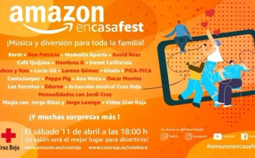 Amazon ha anunciado hoy que acogerá, el próximo sábado 11 de abril a partir de las 18h, un festival de música y entretenimiento para toda la familia, con conocidos artistas y populares celebrities españolas. #AmazonEnCasaFest, con el apoyo de Amazon Music y Prime Video, recaudará fondos para el Plan Cruz Roja RESPONDE destinado a ayudar a los afectados por el COVID-19, y reunirá a familias españolas y de todo el mundo al otro lado de sus pantallas para disfrutar de una tarde de música, baile y muchas sorpresas.