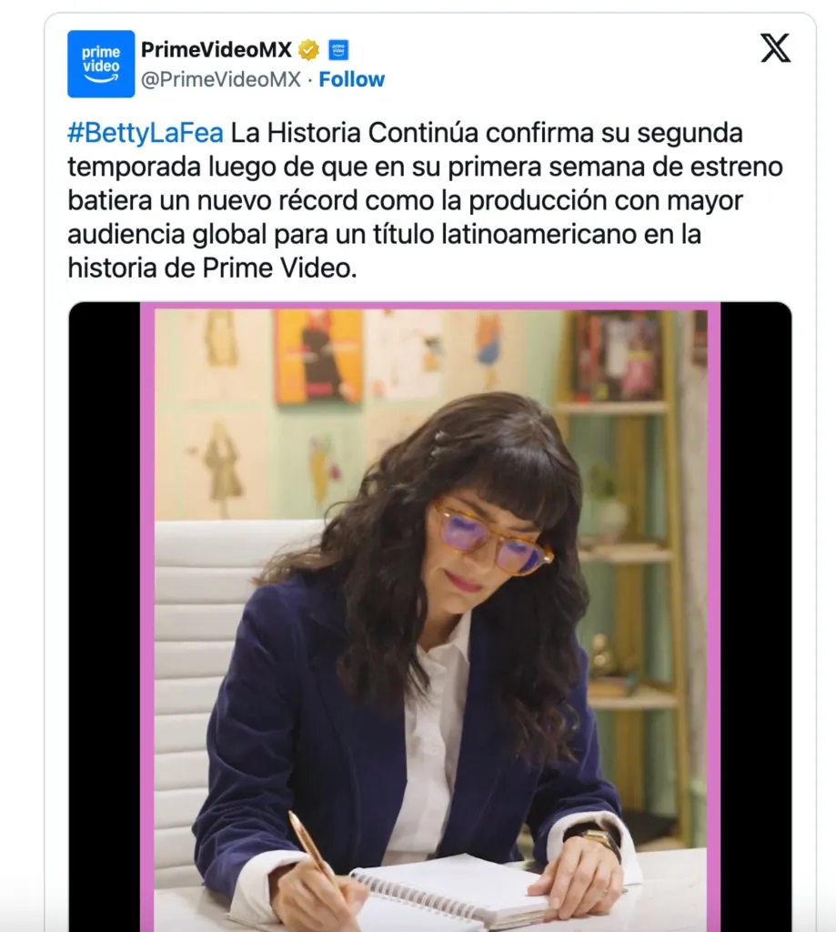 Después de romper récord de audiencia en la primera semana de su estreno en julio 2024 como la producción con mayor audiencia global en un título latinoamericano en la historia de Prime Video, ‘Betty, la fea: La historia continúa’ confirmó que tendrá segunda temporada.