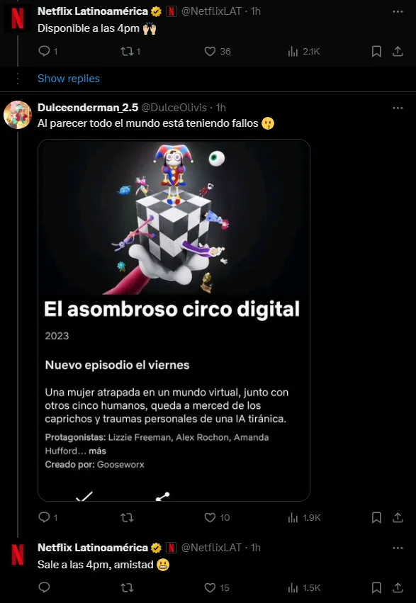 ¿A qué hora se estrena El Asombroso Circo Digital? Si bien los estrenos de Netflix normalmente llegan desde los primeros minutos del día en el que se anuncia que se lanzarán, esta vez ocurrió un cambio y, a través de sus redes sociales, Netflix informó que estará disponible a partir de las 4:00 p. m. (de México.)