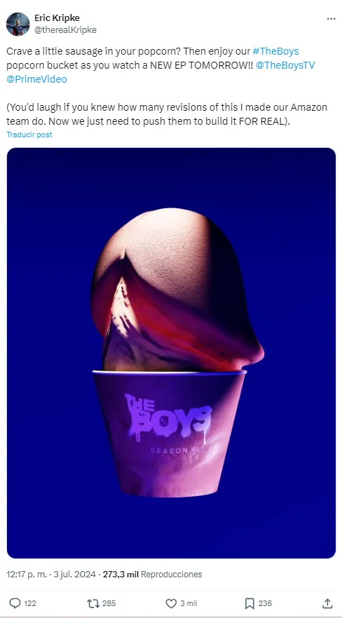 La palomera (popcorn bucket) de The Boys, o al menos la propuesta de la misma fue presentada por Erik Kripke, creador de una de las series más virales del momento y tenemos que decirte que es tan obscena que es NSFW.