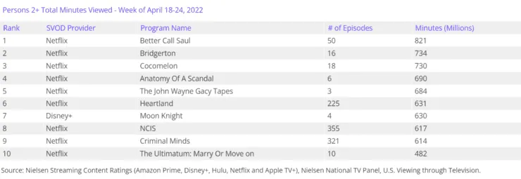 Por su parte, Bridgerton bajó al segundo lugar con 734 millones de horas reproducidas, aún manteniéndose entre lo más elegido por el público estadounidense. El resto del Top 10 se completa con: Cocomelon (730 M), Anatomy of a Scandal (690 M), The John Wayne Gacy Tapes (684 M), Heartland (631 M), Moon Knight (630 M), NCIS (617 M), Criminal Minds (614 M) y The Ultimatum: Marry Or Move On (482 M).