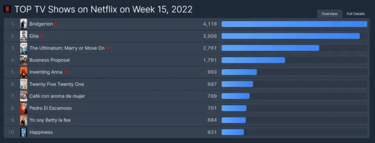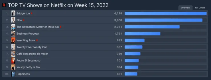 De acuerdo al ranking publicado por FlixPatrol, la segunda temporada de Bridgerton se adueñó nuevamente del Top 10 semanal por tercera vez y deja en claro que no ha abandonado el liderazgo de audiencia al haber obtenido115,750,000 millones de horas reproducidas la semana anterior. De esta manera, ya comienza a posicionarse como una de las series más vistas de 2022.