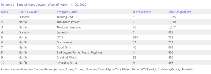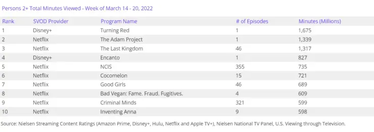 Según la más reciente actualización de Nielsen, lo más visto por los espectadores estadounidenses entre la semana del 14 al 20 de marzo fue la película Turning Red, de Disney+, con un total de 1,675 millones de minutos reproducidos. De esta manera, el film de Pixar Studios vuelve a repetir su liderazgo, ya que la semana pasada obtuvo el primer lugar con 1,701 millones de minutos.