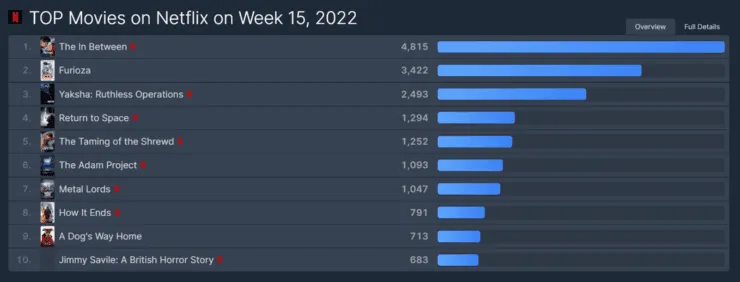 En la anterior actualización, The Bubble se había impuesto como la más elegida en todo el mundo, pero su furor no duró demasiado, ya que las constantes críticas negativas le han jugado en contra a lo nuevo de Judd Apatow. Es por eso que el público dirigió su atención a los nuevos contenidos en el catálogo y en la sección películas se quedaron con The In Between o Entre la vida y la muerte.