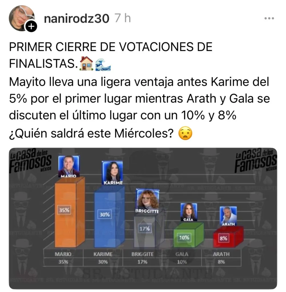 Aunque las votaciones oficiales se mantienen en secreto, en redes sociales ya circulan las encuestas, que reflejan quiénes son los finalistas favoritos para convertirse en el ganador del reality y quiénes están en riesgo de convertirse en el quinto finalista.