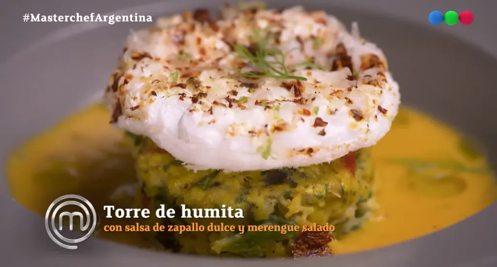 Antonio y Agustín prepararon una torre de humita con salsa de zapallo dulcde y merengue salado.
