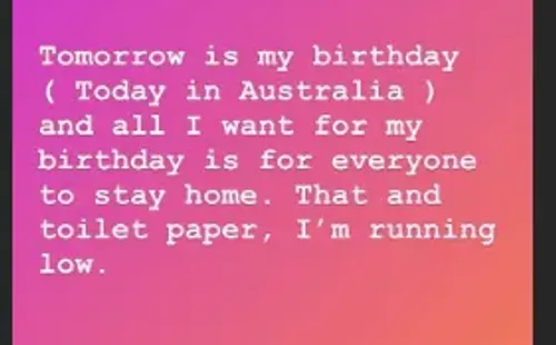 Ruby también manifestó cuál es su deseo de cumpleaños: “Mañana es mi cumpleaños. (Hoy en Australia). Todo lo que deseo para mi cumpleaños es que todos y todas permanezcan en sus casas. Eso y papel higienico, se me está acabando”.