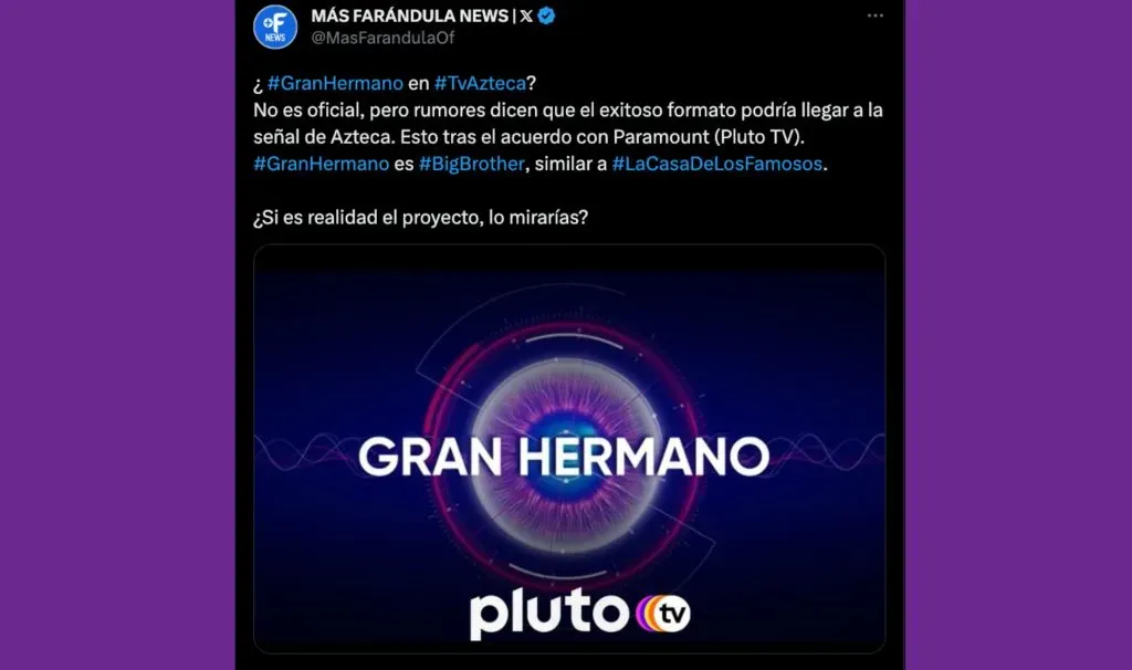 En Twitter cuentas de spoilers y noticias de espectáculos como @MasFarandulaOf , mencionan que tras el acuerdo de TV Azteca con Paramount, Pluto TV podría convertirse en la plataforma digital que transmitiría el 24/7 de Big Brother o Gran Hermano, como VIX lo hizo con La Casa de los Famosos de Televisa.